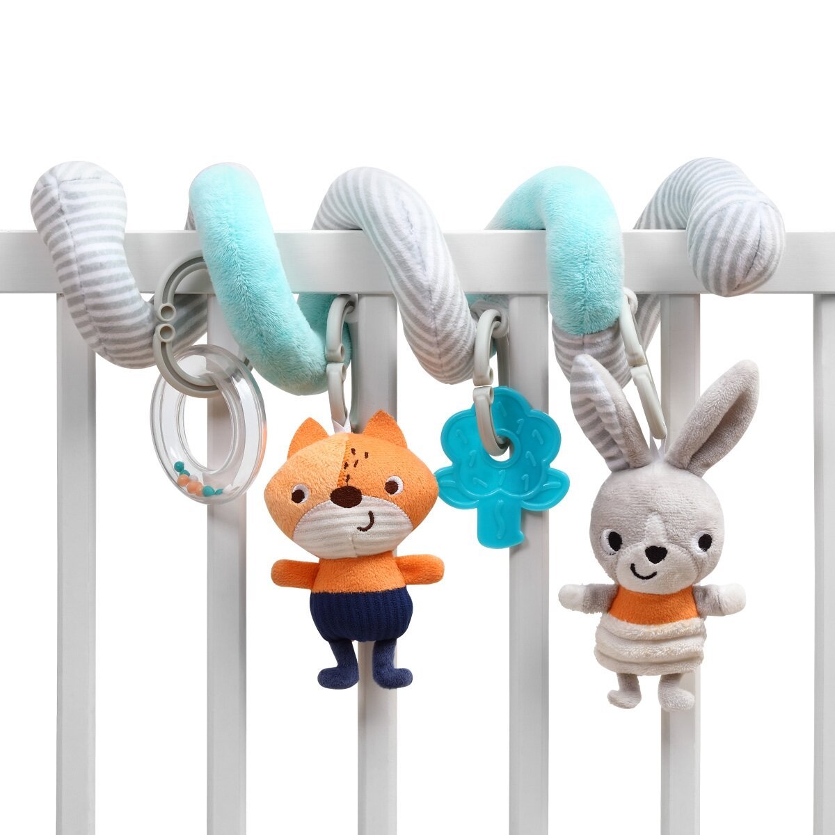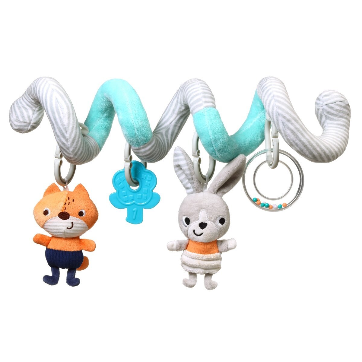 Sensorinis spiralinis žaislas gali lydėti jūsų kūdikį visur, kur jis eina. Galite jį pritvirtinti prie vaiko saugos sėdynės automobilyje, nešioklės, sūpynių ir lovytės, o taip pat prie vežimėlio einant pasivaikščioti. Jis taip pat gali virsti mielu pliušinį žaislą.