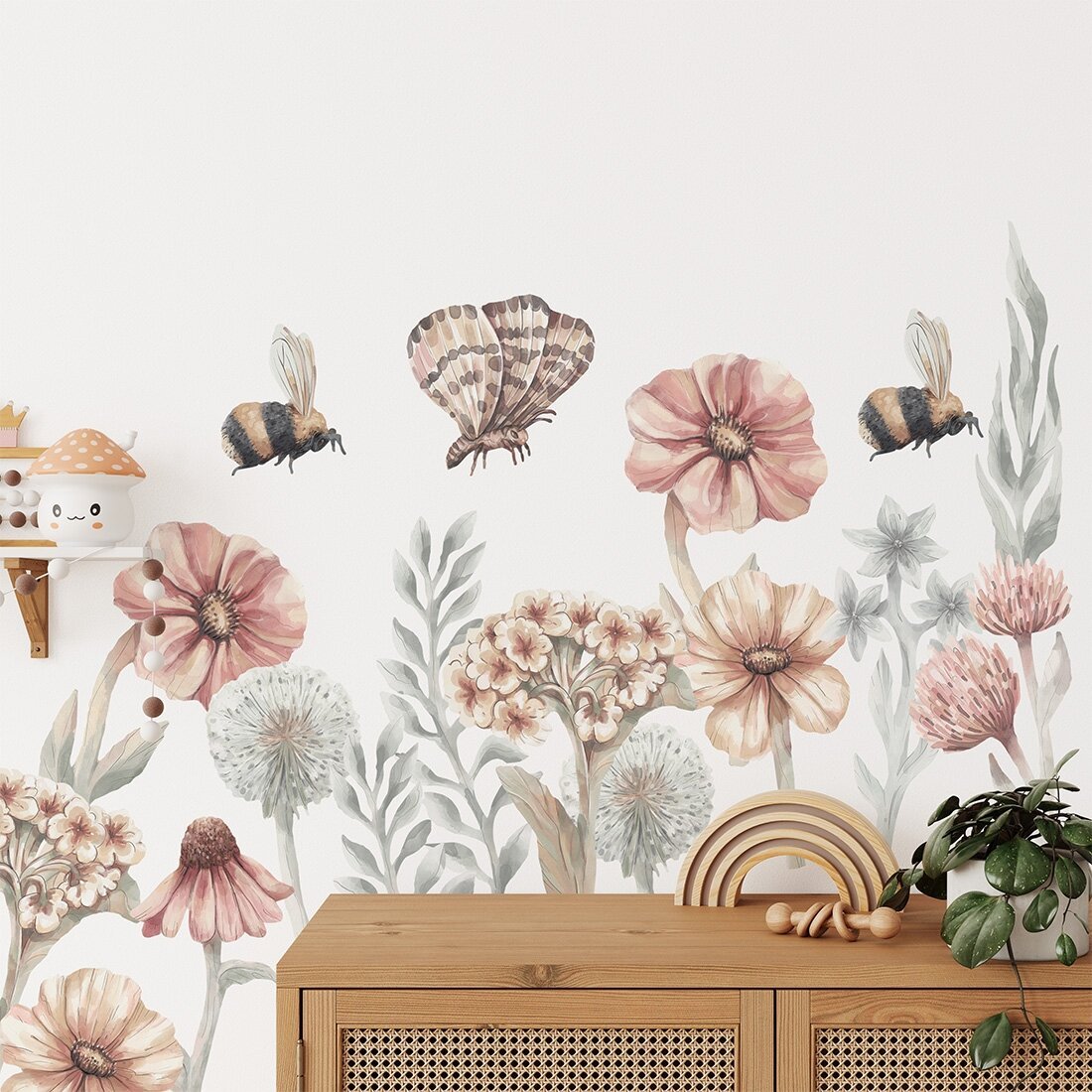 Gėlių pievos sienų lipdukas, papuoštas akvarelės gėlėmis, drugeliu ir bite, yra puikus pasirinkimas norintiems vaikų kambaryje sukurti ramią, gamtišką atmosferą. Nesvarbu, ar jis derinamas su skandinavišku ar bohemišku stiliumi, šis dizainas išsiskiria unikaliu kūrimo procesu. Pirmiausia buvo sukurti rankų darbo akvarelės eskizai, tapę visos kolekcijos įkvėpimu. Tada, naudojant pažangias kompiuterines technologijas, buvo kruopščiai paruoštos spaudos medžiagos, taip gaunant iš tiesų išskirtinę seriją.